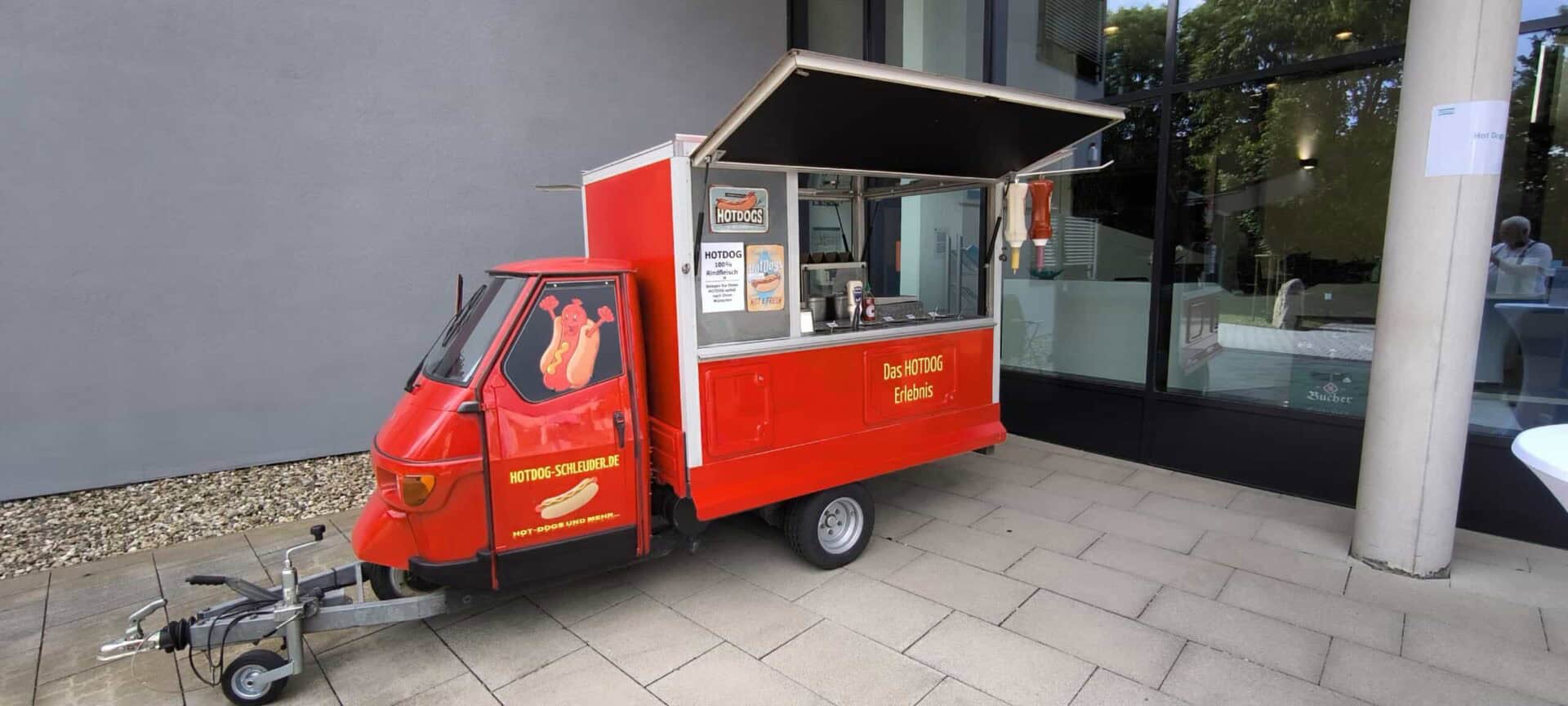 Die Hotdog-Schleuder ist seit über 20 Jahren unser Kult-Foodtruck für Hotdogs, Pulled Pork und Chili con Carne. Sie ist ein echter Hingucker und hat schon auf unzähligen Events für Begeisterung gesorgt, der Wagen wid mit Gas betrieben und ist autark.